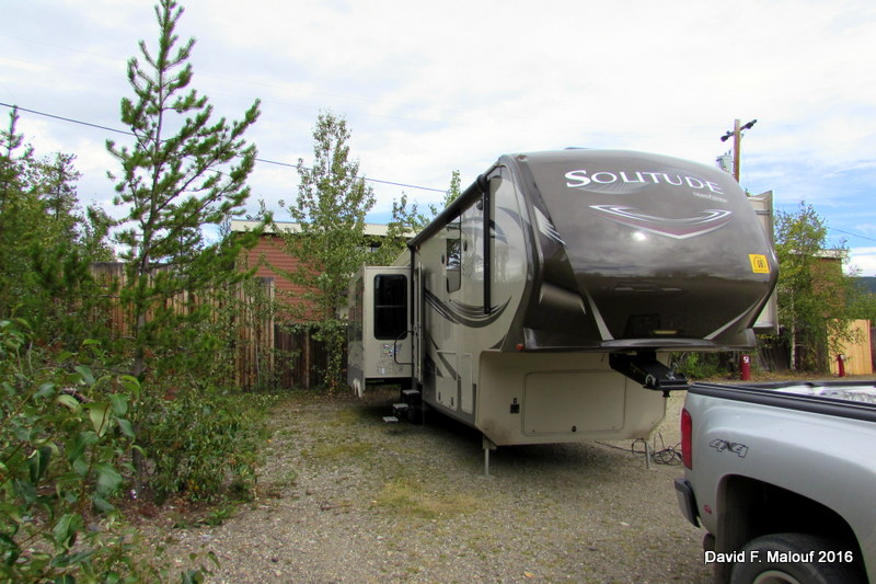 Our site at Pioneer RV Park in Whitehorse YT, we were lucky to get an end site. Sites are really tight, with slides out no room to walk between the rigs. Our day ended with a travel meeting covering our Whitehorse YT stay and our upcoming drive to Dawson City YT.